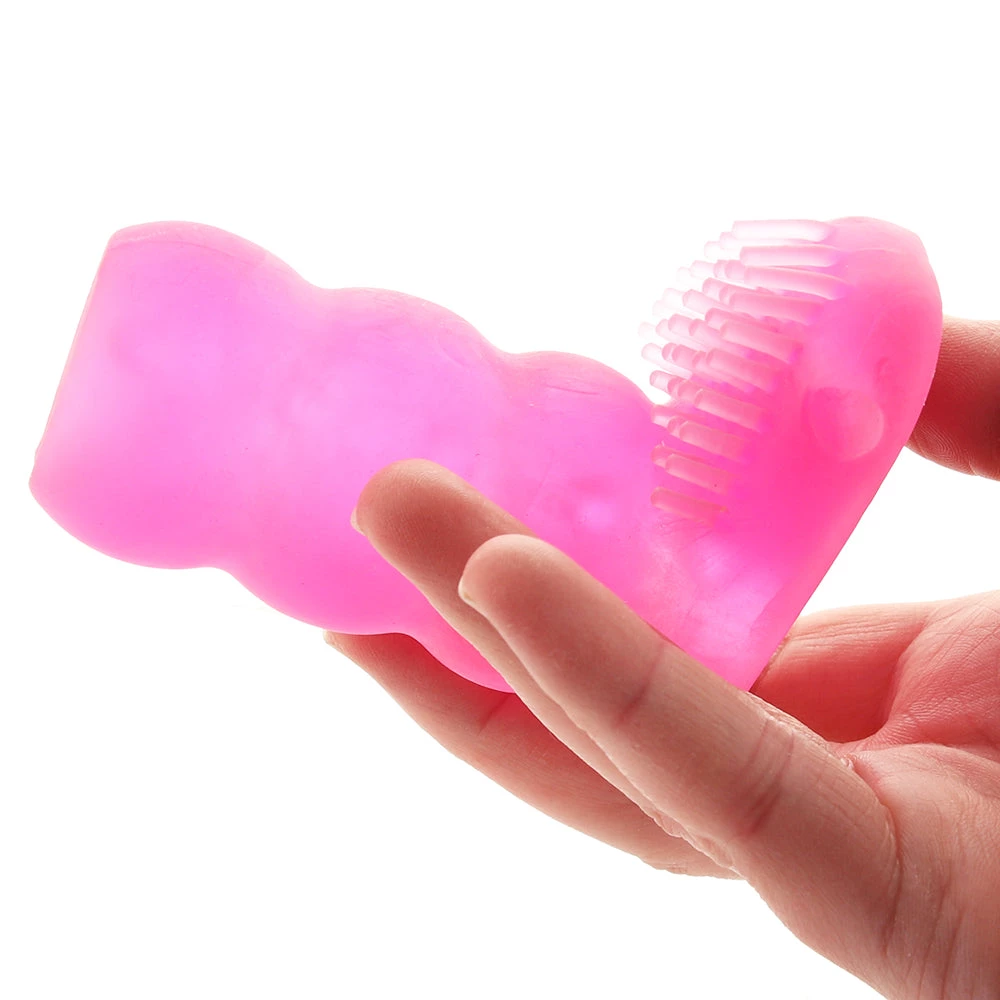 Fitting securely over your or your partner’s penis (or a dildo), the sleeve adds lots more thickness and some very exciting texture. All that is great on it’s own, for sure, but there’s also an amazing vibrating stimulator positioned just right at the far end of the sleeve. During foreplay and penetration, some soft, flickering ticklers buzz and throb against a partner’s clit and other outer sweet spots.