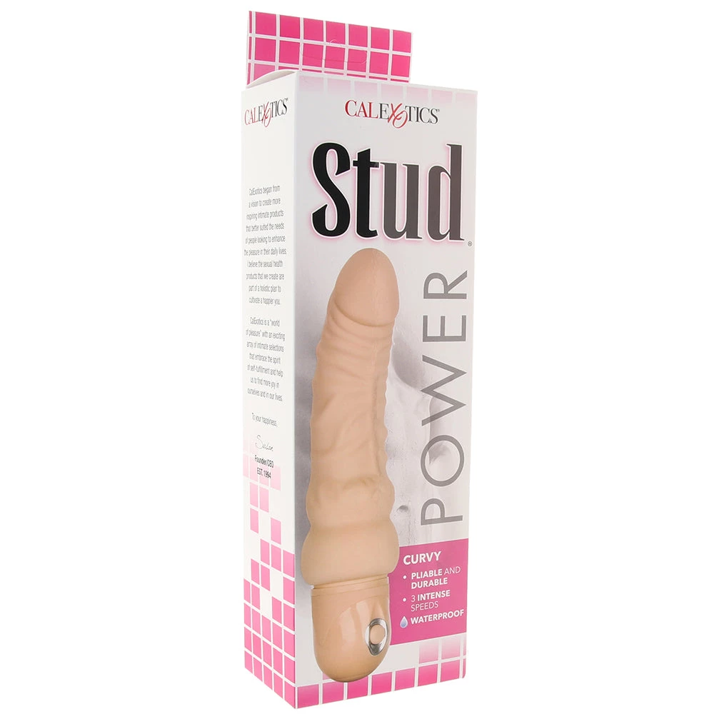 Thick through the shaft and smoothly tapered up top, the Power Stud Curvy’s firm-yet-plushy penis-inspired shaft showcases some very sexy detailing and a bumpy, stimulating veined texture. It’s great for g-spot seeking and other inner orgasm quests, but will target outer erogenous zones perfectly, too. Three speeds of super-powered vibration are yours for the choosing, and one simple power and function button on the handle controls all.