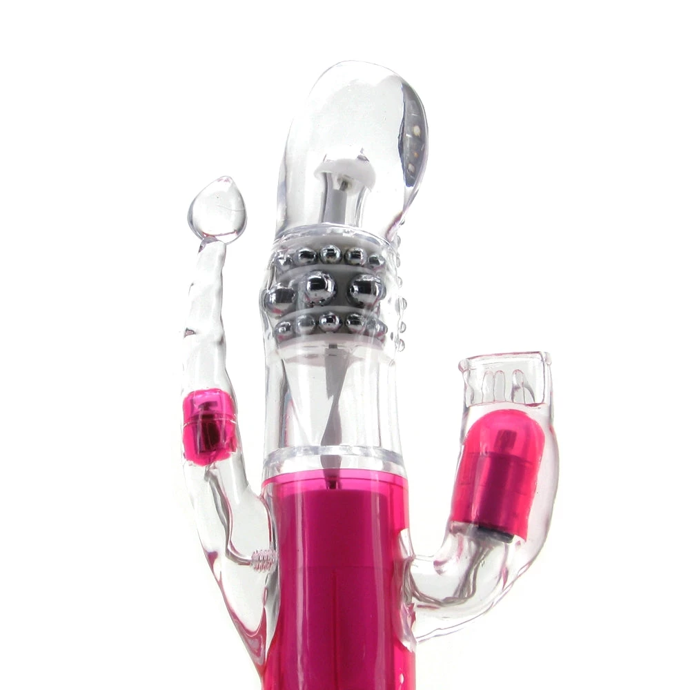 The French Kiss vibe from the Triple Orgasm collection is packed with so many amazingly pleasurable features, it’s hard to know where to start. You’ll notice the unique styling right away, this vibe looks great, but that’s nothing compared to how it’ll feel. A big plush head tops the shaft of the Kiss, it’s split down the middle on one side, revealing a line of soft nubs that run through the middle, and down past the triple row of silver rotating beads embedded in a soft curve just underneath. On either side of the shaft, which is longer than average for deep penetration, there are 2 stimulators, one for the clit and one for anal pleasure; both are nice and flexible so they can be positioned where they’ll please you most. The clitoral side is shaped into a soft cup that fully surrounds your key sweet spot, the middle of the cup is filled with long, soft fingers that tickle and tease as the independant motor placed underneath sends turbo charged stimulation at 8 speeds and 3 functions straight to you. There’s another motor keeping things even in the head, it also controls the beads in the shaft, which rotate at 8 different levels of intensity along with the head. Yet another motor sits in the center of the anal stimulator, which is long and thin, topped with a smooth, tapered bulb in a teardrop shape. All three motors are synchronized, so if you choose to have all 3 going at once, they’ll vibe in perfect harmony; the shaft and anal vibration is controlled on one side of the simple interface at the base, while the clit stimulator has independent push buttons on the opposite side. Along with the 8 speeds for each motor, there are also 3 patterns of vibration that mix up pulsation and escalation, providing totally unique sensations, combined with all the speeds, the permutations of pleasure are many (500+ to be exact). The French Kiss is made from completely body safe, phthalate free TPR material, letting you play worry free in or out of water, as it’s completely waterproof. Use a good water based lube if needed. Takes 3 AA batteries (sold separately).
