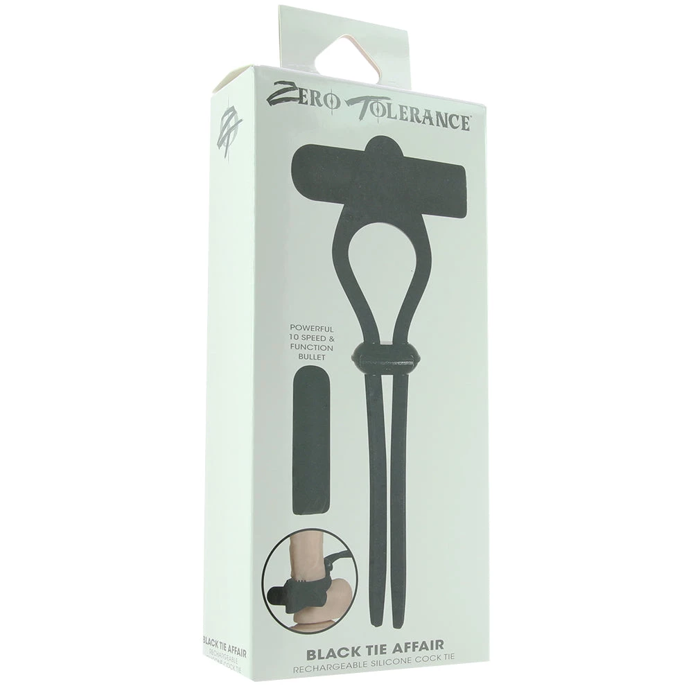 The Black Tie Affair Rechargeable Silicone Cock Tie by Zero Tolerance includes 2 sexy, stand-alone play tools that also happen to complement each other – a classic silicone cock tie and a super-charged ten mode bullet vibrator. Looping securely around the base of your or your partner’s penis or strap-on, the Black Tie adjusts to a perfect fit thanks to a sturdy slider ring.