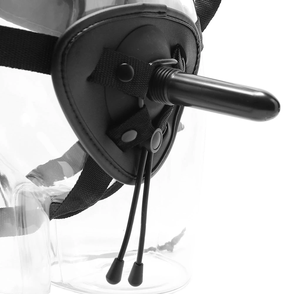 Here’s how the Heavenly Harness works. First, you’ll slip into the soft, secure, completely adjustable harness and tighten up the straps to fit you just right. Maybe you’ll admire some pretty corset lacing up the back while you’re at it. Next, you’ll slip a vibrating suction cup base through the lasso style O-ring (you can do this ahead of time, too), twist on one of two black silicone attachments, and play away! If you’d like to play with a dildo or probe you already own and love, no problem! Just pop out the suction base and replace it with any compatible penetrator.