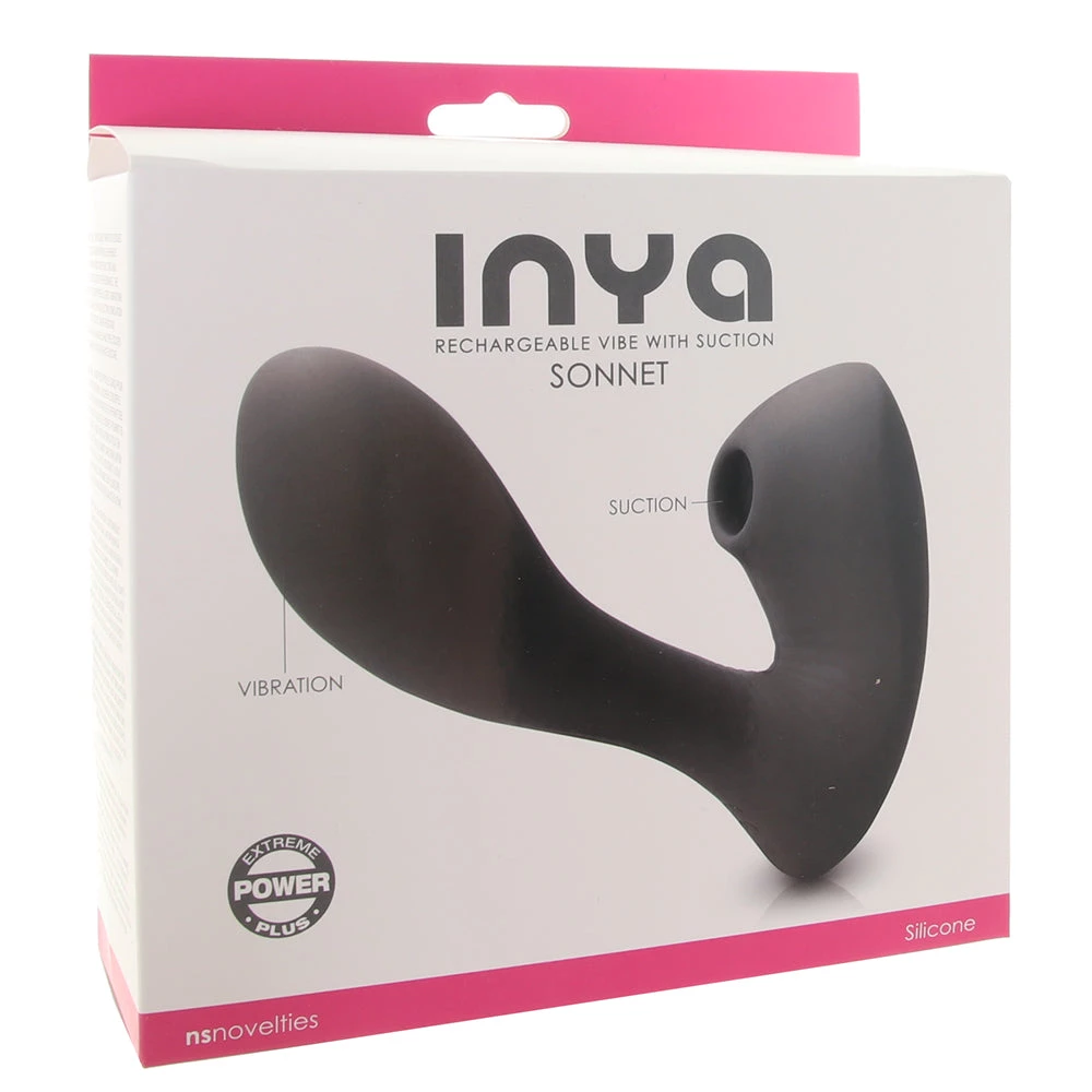 In 100% silicone, the Inya Sonnet G-Spot Vibe with Suction is body safe, phthalate free and extra hygienic. Wash well before and after playtime using warm soapy water or a good toy care fluid/foam. If you’ll be pairing a lube with this vibe, please use a favorite good quality water-based formula. Please avoid contact with silicone lubes, and store away from other silicone toys. Sonnet is splash-proof, but shouldn’t be fully submerged.