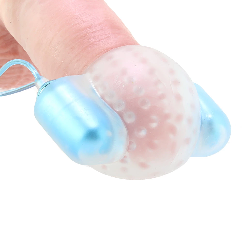 Fitting snugly and completely over the tip of the penis, the Teaser’s design places two super-powered little bullet vibes on either side of your/their sensitive head. Supple and soft, the textured, transparent blue sheath stays in place easily to enhance (or take over for) manual masturbation. A slim wired emote varies the intensity of the bullets. Pass it off to a mate or keep it all to yourself