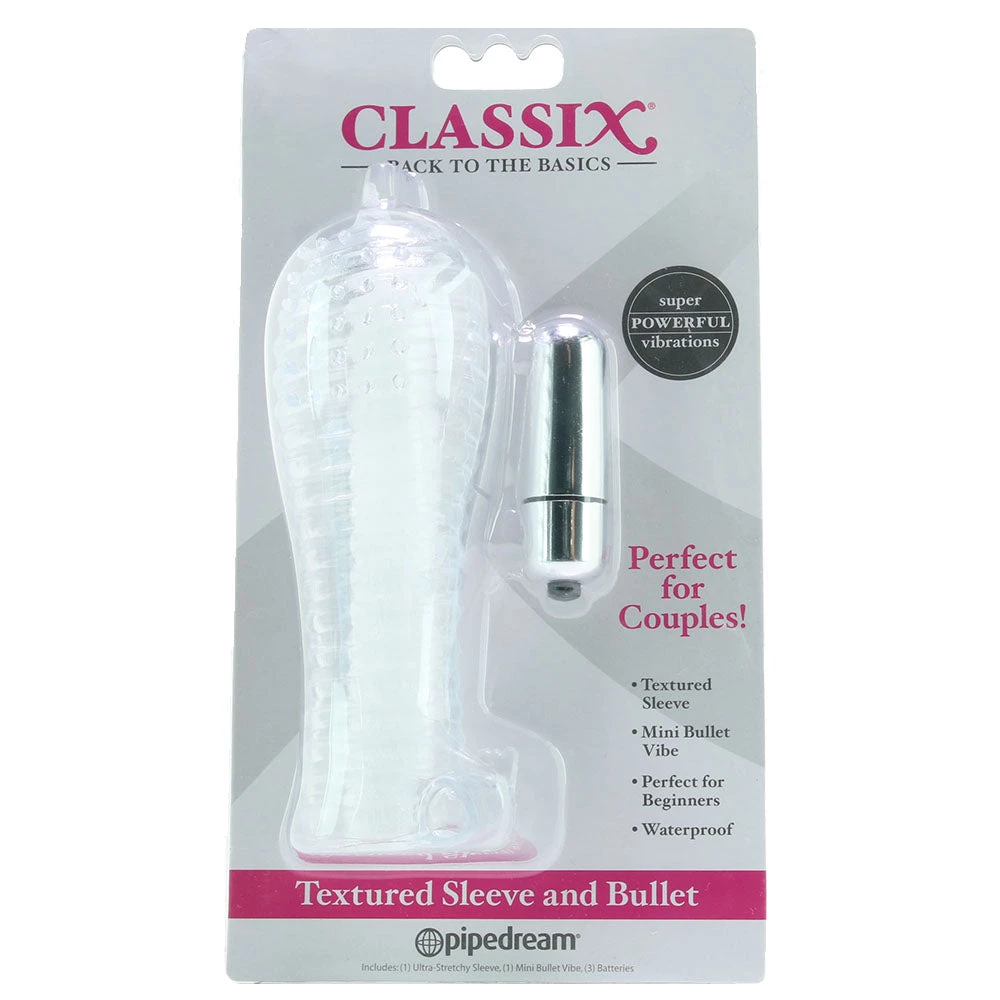Everyone loves a really great combo! Big Mac and coke, shampoo and conditioner, chocolate and peanut butter – or, in sex toy world, a bullet vibe and a sexy-textured enhancer. Surprise! The Classix Textured Sleeve and Bullet set contains just that. First, a beloved bullet and second, a fantastically stretchy jelly sleeve.