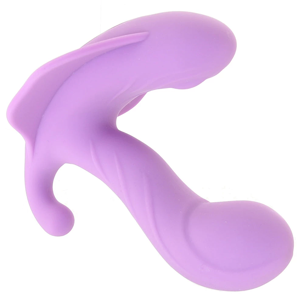 Meanwhile, the base of Stimulate-Her is ready to get going on some very important business of its own! Shaped into a curvy butterfly, it angles up to seek, find and stimulate your or your partner’s clitoris. A separate motor synced to the one above guarantees equally powerful outer attention while a devious little anal tickler teases from behind.