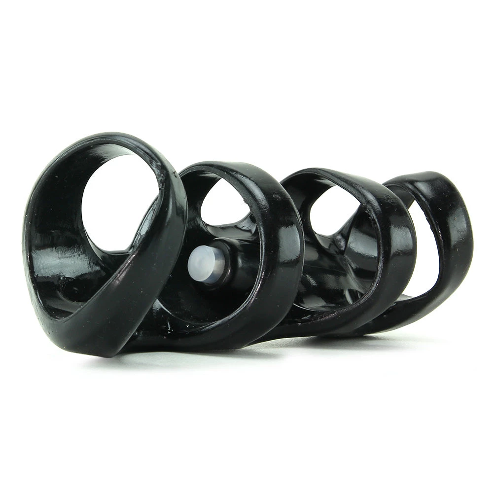 Featuring an open design for lots of skin to skin contact, this X-Tensions piece naturally adds little texture and thickness toward the back of the shaft- the three subtly snug bands gently constrict the penis, assisting with control and stamina. Placed up top, lying vertically through the three bands, a tiny, powerful little vibe positions itself directly in the path of a playmate’s clitoris or perineum, massaging delightfully with every thrust. Measuring in at 3.5″ (8.8cm) long, and 1.3″ (3.3cm) at inner diameter, the Cage stretches to fit most men.
