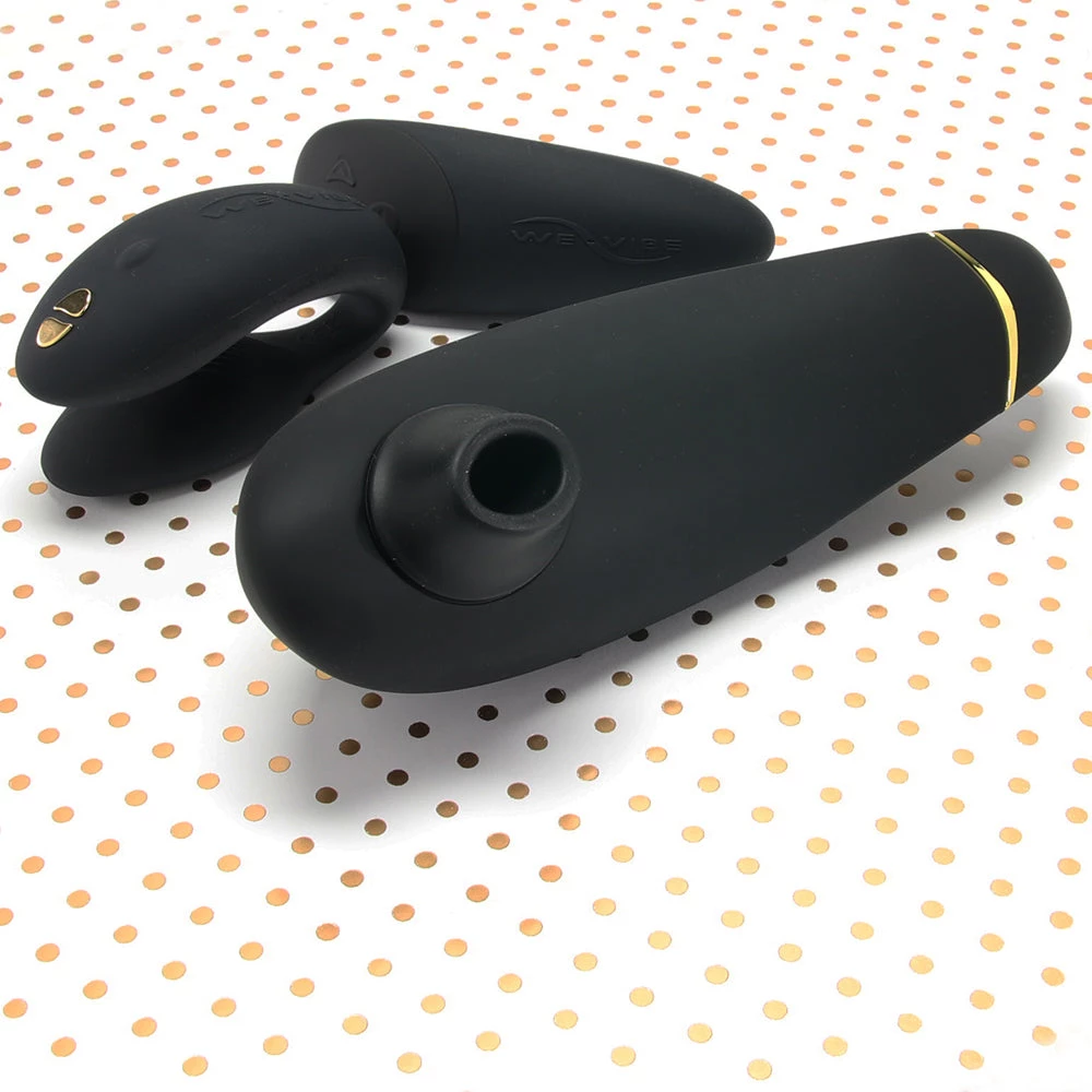 Combining two beloved pleasure pieces into one gift-ready (or hoard-worthy) kit, the Golden Moments set includes a couple-perfect We-Vibe Chorus and a Womanizer Premium clitoral stimulator, both in jet black with luxurious golden accents.